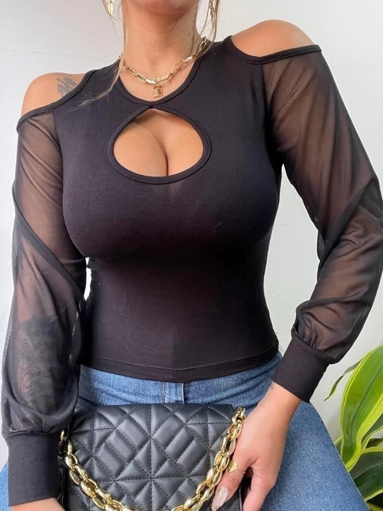 Camiseta Modal Viscosa con Tull Manga Larga Escote Gota Hombros Descubiertos Prenda sofisticada y femenina, confeccionada en modal viscosa que aporta suavidad, elasticidad y una caída elegante. Sus mangas largas con detalles en tul generan un contraste delicado y moderno, mientras que el escote en forma de gota y los hombros descubiertos realzan la silueta con un toque sensual y distinguido. Ideal para looks de noche o para elevar un outfit casual con estilo único.